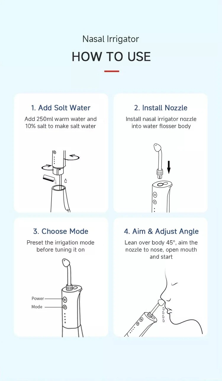 【Conselles giratòries de 90 graus】 El disseny de la punta giratòria de 90 graus del netejador nasal és més eficaç que l'olla Neti o altres dispositius d'esbandida nasal. Amb un disseny impermeable IPX7, l'esbandida nasal permet esbandir l'aigua de tot el cos, que és més fàcil de netejar i cuidar la cavitat nasal.