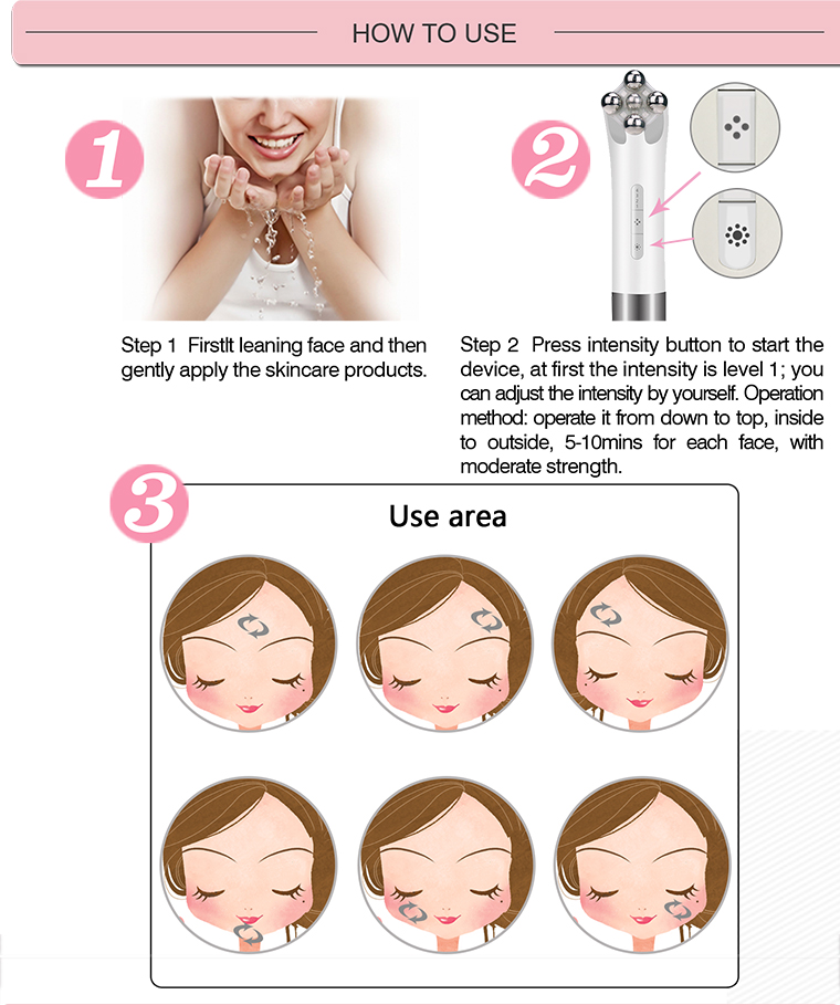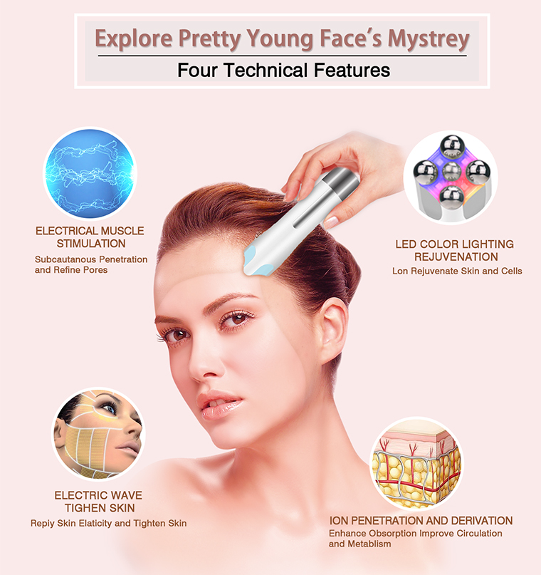 MASSATGE FACIAL D'ALTA FREQÜÈNCIA: en els modes de neteja, penetració, lifting i cura dels ulls, sent una sensació de vibració d'alta freqüència per ajudar a estimular la viabilitat cel·lular i afavorir la circulació sanguínia. Així que en realitat també és un massatge facial.
