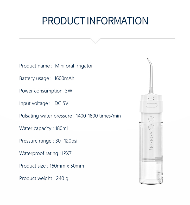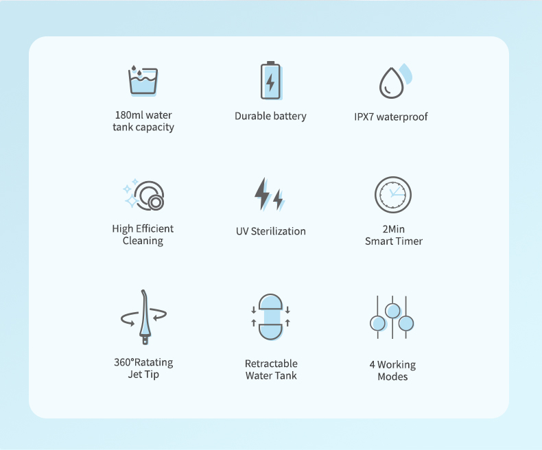Aquesta selecció dental d'aigua proporciona polsos d'aigua d'alta pressió a 1400-1800 vegades per minut, eliminant eficaçment el 99,9% de la placa dental per a la neteja profunda de les dents. Aquesta selecció dental amb fil d'aigua fa massatges a les genives, afavoreix la circulació sanguínia i tracta problemes orals com el mal alè, les dents d'ortodòncia.