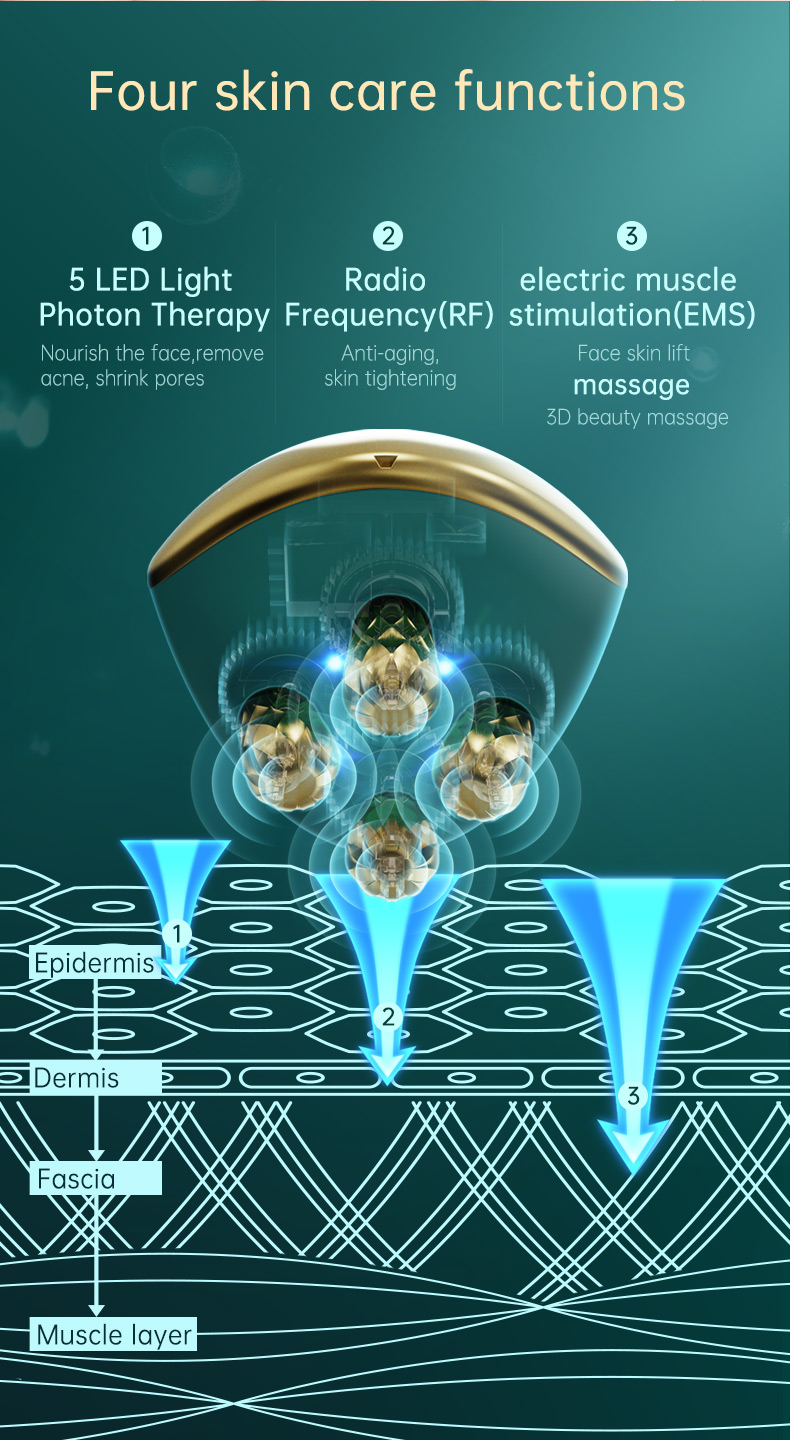 QUINS SÓN ELS BENEFICIS? -- La màquina de bellesa és un dispositiu anti-envelliment multifuncional que inclou tecnologia de radiofreqüència (RF) amb teràpia de llum vermella/blava, EMS per reduir línies i arrugues, millorar la penetració de la pell i les capacitats d'absorció, etc.