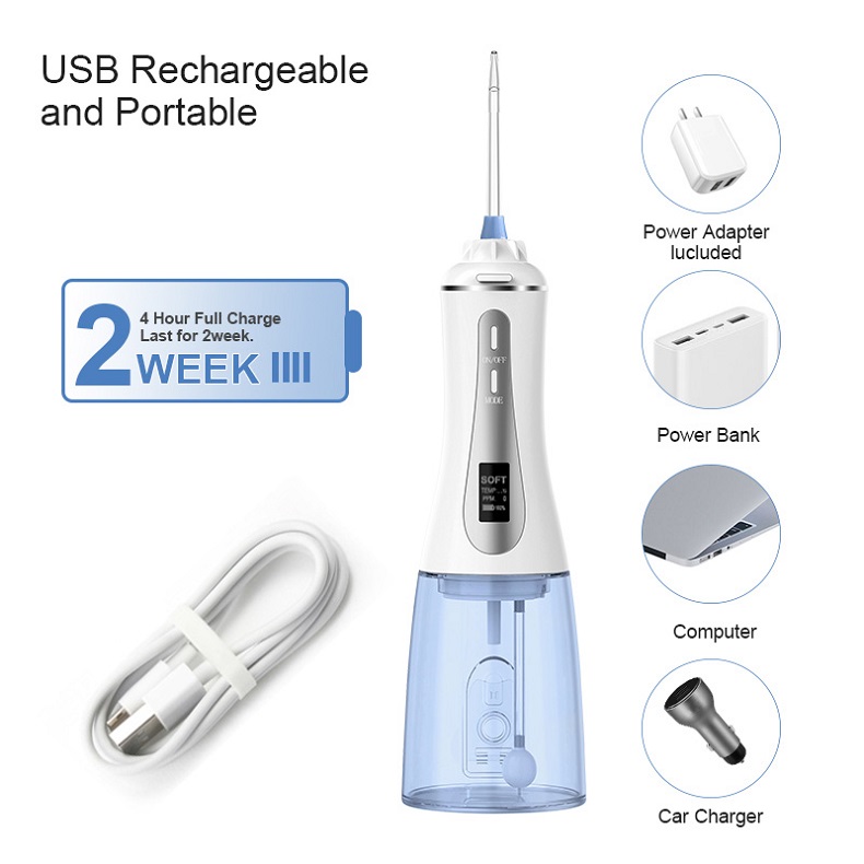 Aquest fil dental d'aigua té el doble de durada de la bateria d'altres amb una potent bateria ecològica. Només cal carregar durant 3 hores i gaudir de 30 dies d'ús. És compacte i lleuger, perfecte per a ús domèstic i en moviment. Aquesta selecció dental d'aigua ve amb un cable USB (adaptador no inclòs) que la converteix en un kit de viatge ideal. Beneficieu-vos d'una durada de bateria excepcionalment llarga de 30 dies, la qual cosa la converteix en una solució realment portàtil per a la vostra comoditat