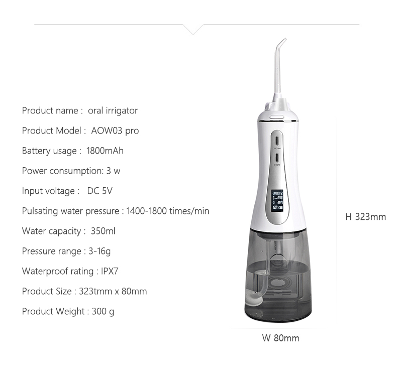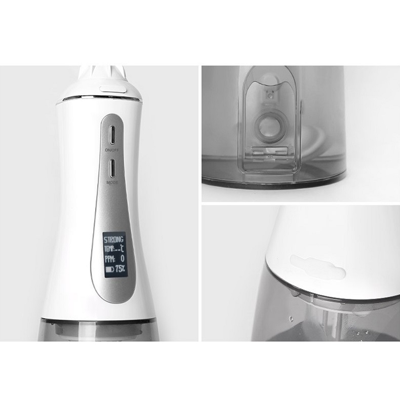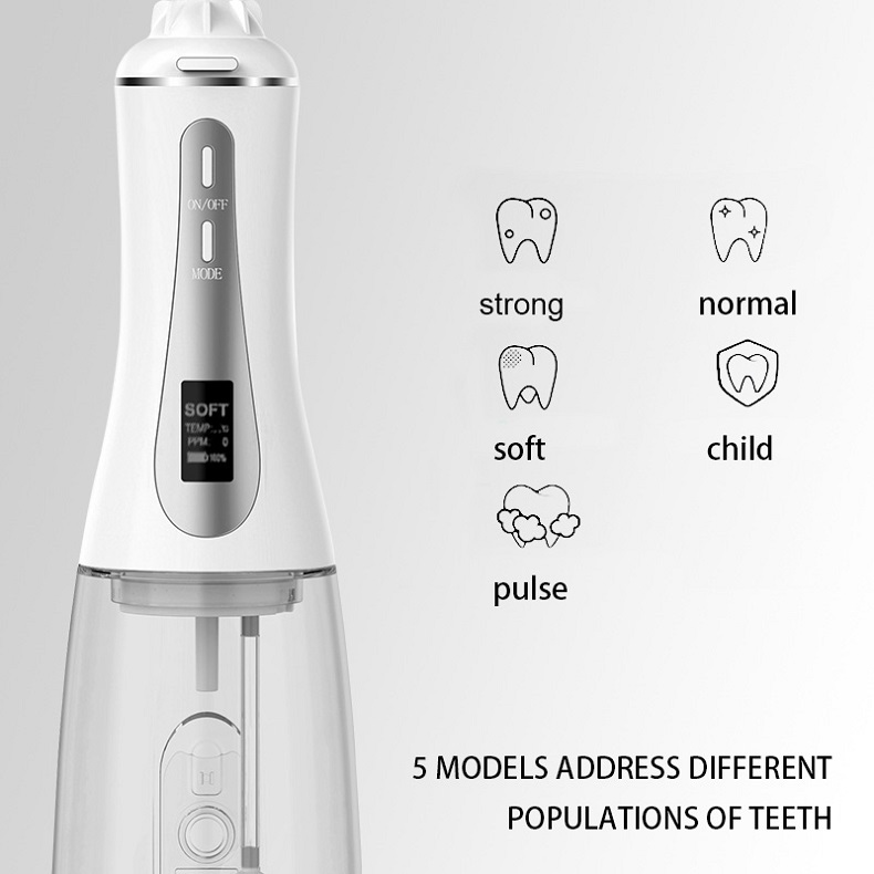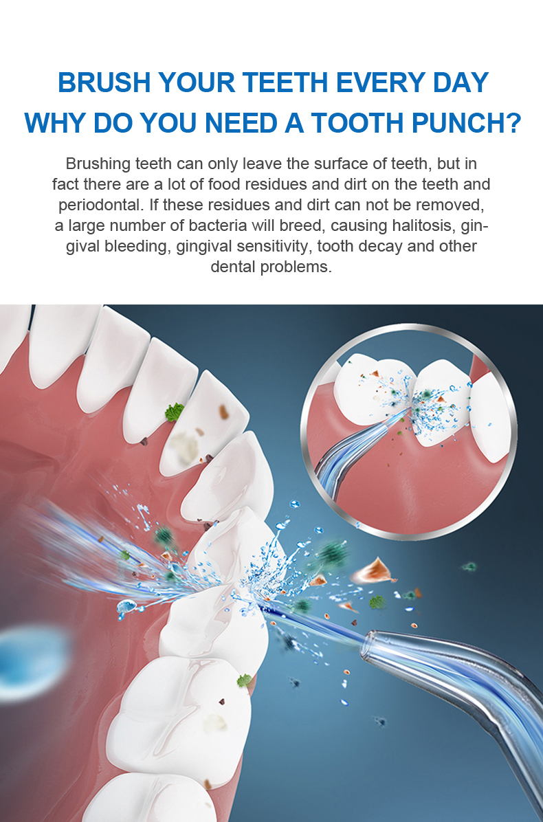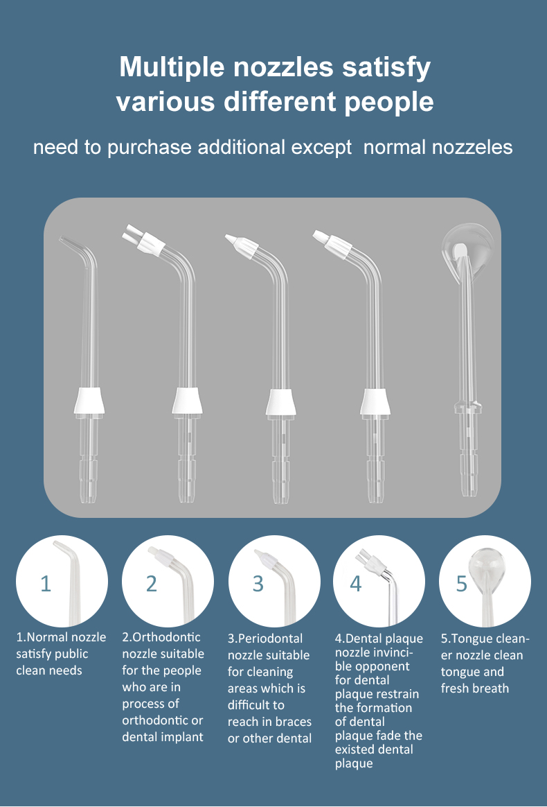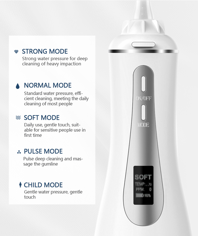 Aquesta selecció dental d'aigua ofereix polsos d'alta pressió d'aigua a 1400-1800 vegades per minut, eliminant eficaçment el 99,9% de la placa dental per a la neteja profunda de les dents. Aquesta selecció dental d'aigua massatges les genives, afavoreix la circulació sanguínia i tracta problemes orals com el mal alè, les dents d'ortodòncia.